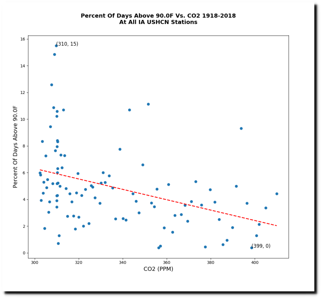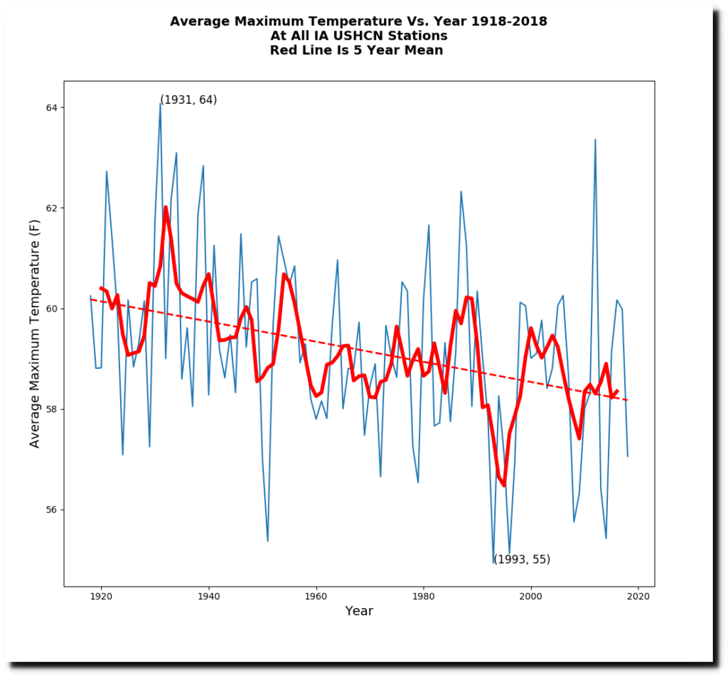 All evidence shows the exact opposite. Average daily maximum temperatures in Iowa have plummeted over the past century.