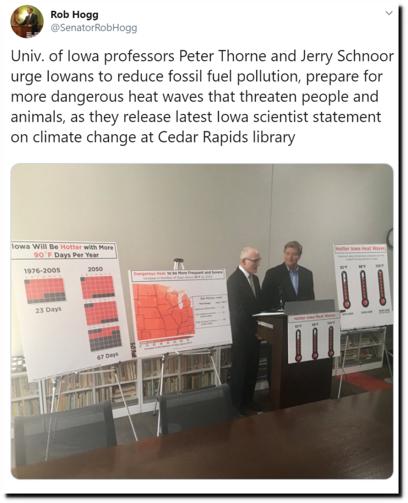 University of Iowa professors Peter Thorne and Jerry Schnoor tell the world that Iowa will get a lot more 90 degree days in the future as a result of Iowa residents emitting CO2.