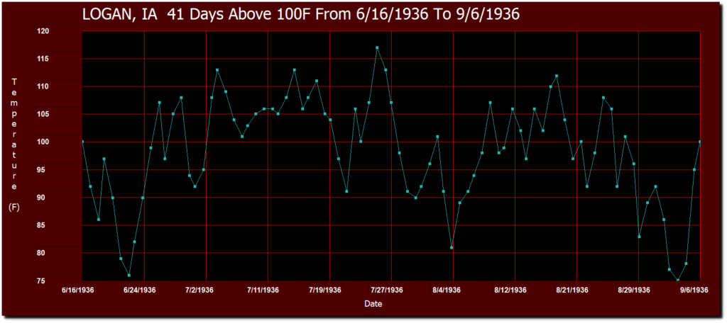 Iowa’s worst heatwave occurred in 1936, when Logan had 41 days over 100 degrees from June 16 to September 6.