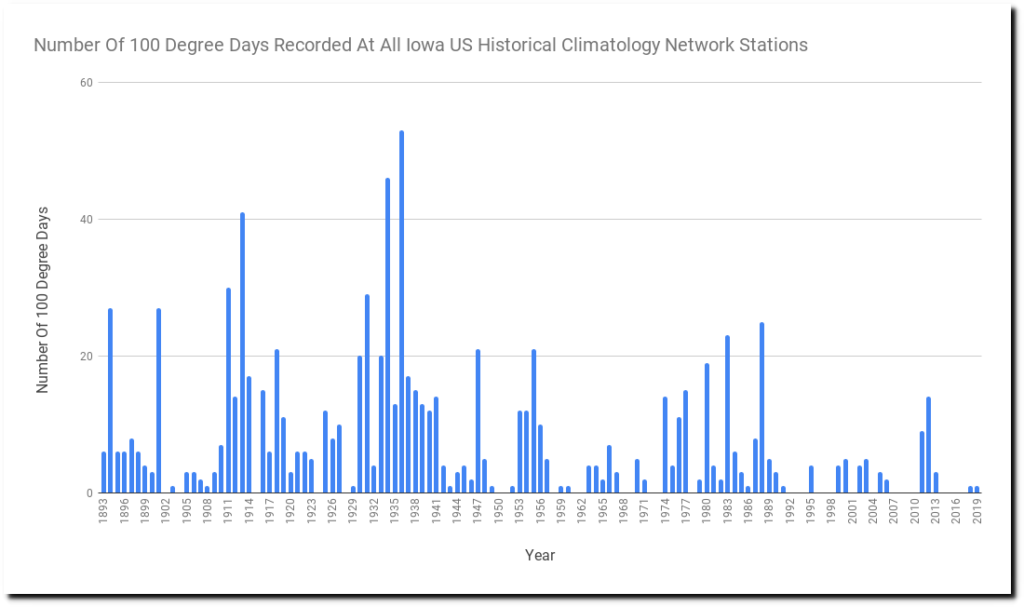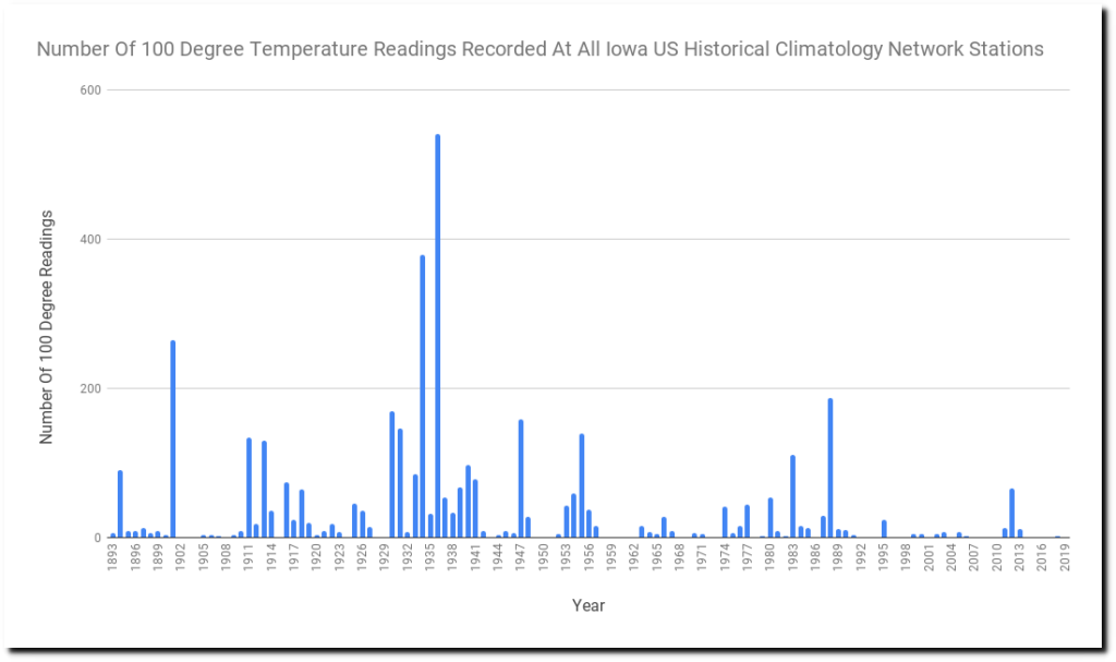 The number of 100 degree temperature readings in Iowa has plummeted.