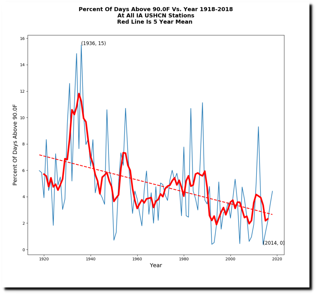 The frequency of 90 degree days has plummeted in Iowa over the past century.