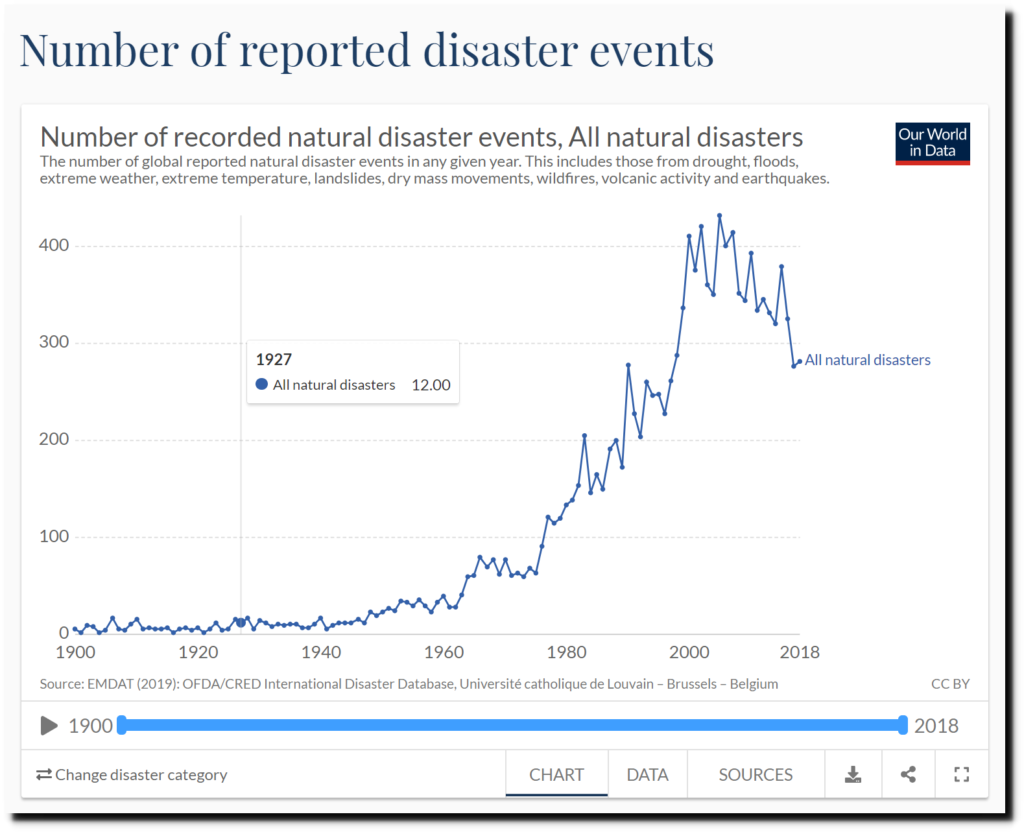 Oxford University shows a huge increase in reported natural disasters since 1900, including twelve in 1927.