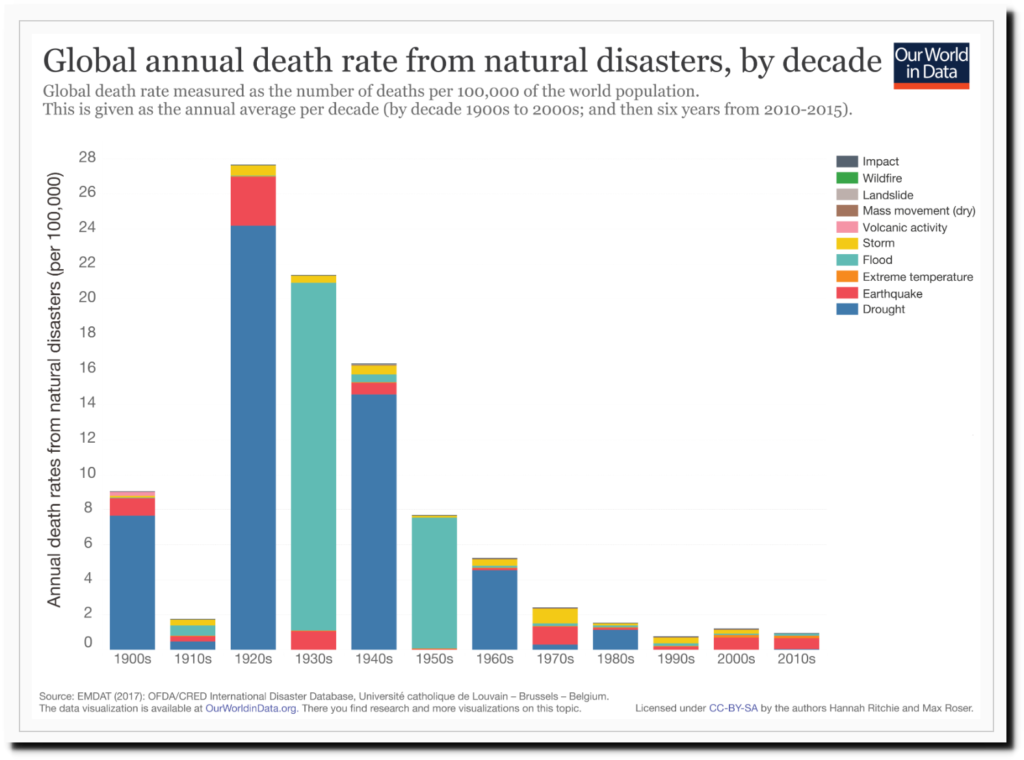 Obviously the person who generated the graph didn’t do any research, and is simply making numbers up. Another graph from the same website shows death rates from natural disasters down 95% since the 1920s.