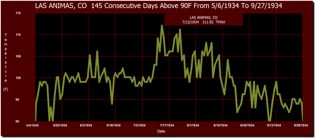 Las Animas, Colorado had 145 consecutive days above 90F from 5/6/1934 to 9/27/1934, and averaged 100 degrees for the daily maximum during that period.