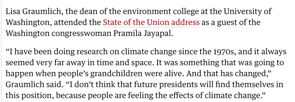 Take Dean Lisa Graumlich. She attended the January 2019 State of the Union speech as a climate scientist protestor as guest of Congresswoman Jayapal (D. WA). Dean Graumlich was quoted widely in the media as the UW COENV Dean, with no attempt to clarify that she was not speaking for the UW when she provided politically laden comments. And her political activities were spotlighted in the College’s official newsletter.