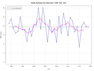 I should note that he, I and Dr. Mark Stoelinga wrote a paper describing only modest loss in Northwest snowpack, a paper that was accepted in a leading peer-reviewed journal. The snowpack loss today? Check the figure showing the Northwest snowpack since the early 1980s; nearly unchanged. Mark Albright was right.