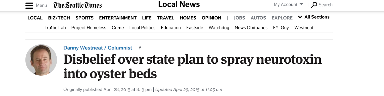 In September 2013, the Seattle Times ran a glossy series called “Sea Change”, which claimed that ocean acidification caused the deaths of untold numbers of local oysters in factory nurseries. There were serious technical problems with the article, including the fact that the oyster deaths were of a non-native species in industrial nurseries and that the problem was not really the small amount of acidification by increasing CO2, but rather the mistaken ingestion of less basic upwelled water (as noted by many sources, including leading NOAA scientists). Furthermore, several of the oyster farms were spraying herbicides and pesticides over state waters and greatly disturbing fragile coastal areas (issues that came out in 2015 in story by the Seattle Times Danny Westneat).