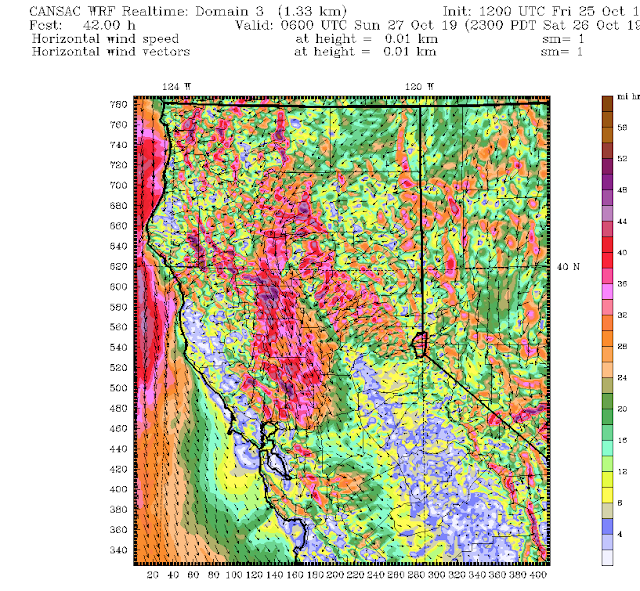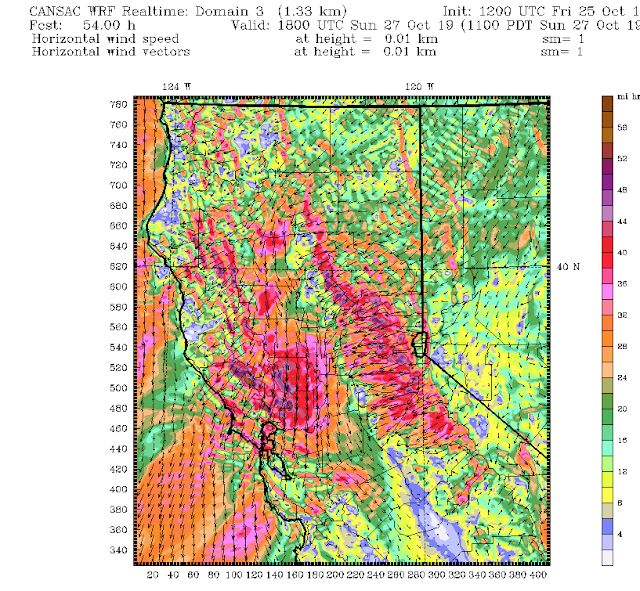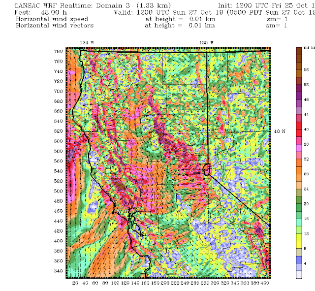 Six hours later, all hell is breaking loose. Sustained winds of 50 mph or more are found on the western slopes of the Sierra Nevada and on/downstream of some of the higher crests of the terrain north and east of San Francisco (such inthe Sonoma County area in which the Kincade fire is burning). The strong winds are found in regions of acceleration associated with mountain waves.