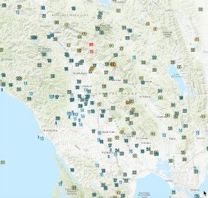 One good thing is that PG&E has added hundreds of surface observation sites that provide an extraordinary view of the winds in the region. To illustrate, here is the maximum gust map for Thursday, north of San Francisco. Lots of observations–and you can see the strong winds (75 and 80 mph) associated with the Kincade fire. Not how winds change very rapidly in short distances. Very valuable.