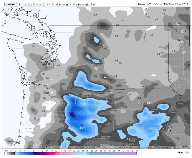 To illustrate, take a look at the European Center cumulative snow forecast from the latest run. Through 4 AM Sunday– no issues in the west.