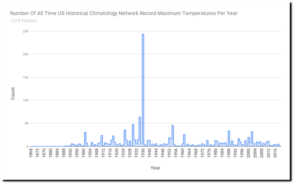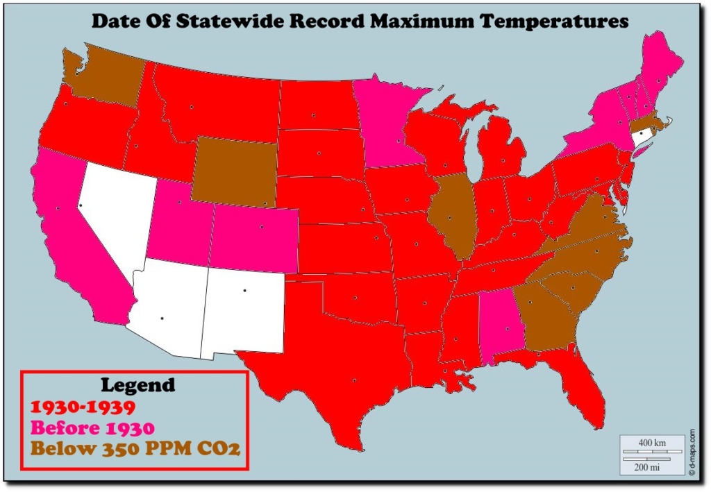 The vast majority of US states set their all-time temperature before 1940, and all but four set their record with CO2 below 350 PPM CO2.