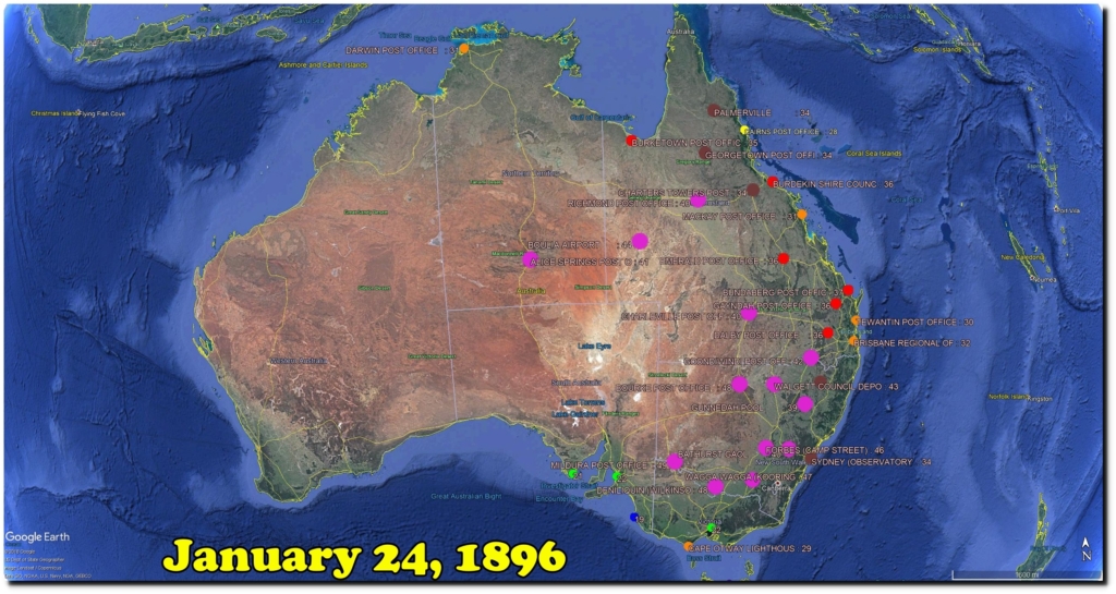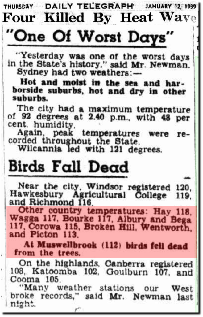 Let’s look at some past heatwaves, and see if the BOM excuses for hiding past heat are valid. The January 1878 heatwave was global, and caused birds to drop out of the trees. BOM seems to believe that the birds would have been OK, had observers kept their thermometers out of the sun.