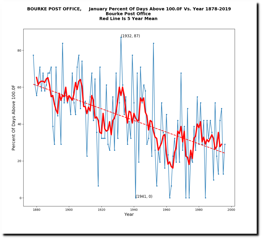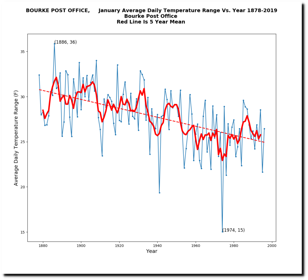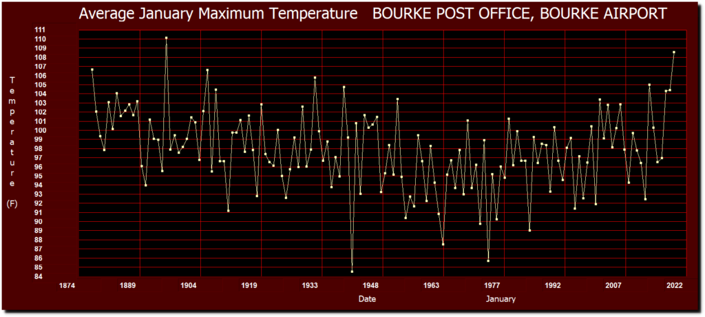 BOM claims that a change to the thermometer housing at Bourke in 1908 caused a step change of 2C cooling, but the temperature data shows nothing of the sort. Temperatures at Bouke cooled steadily from he 1870s to the 1970s.