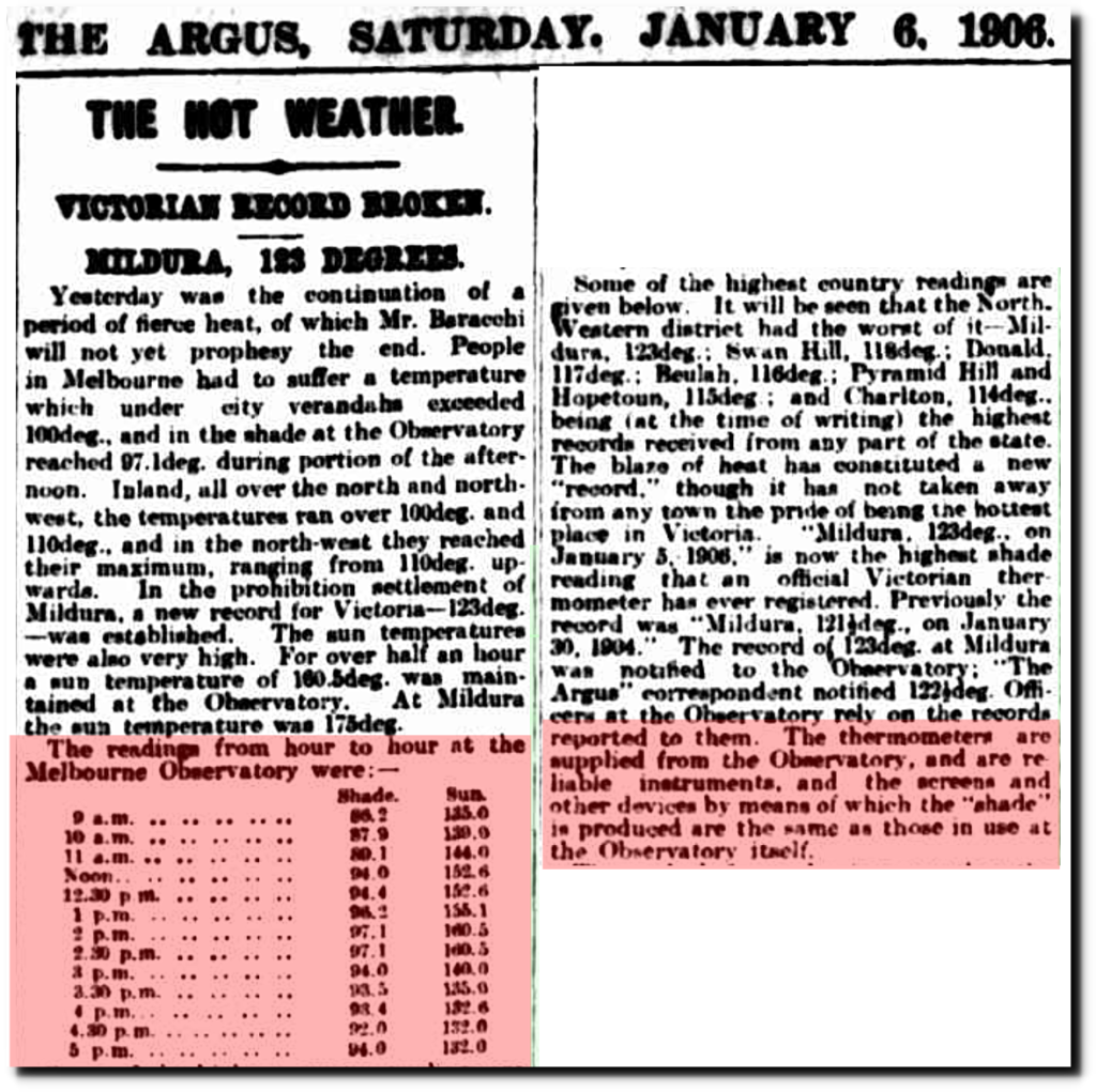 Victoria’s hottest day on record was January 7, 1906. The Argus reported that the equipment was reliable, and that temperatures were taken every half hour both in the shade and the sun. Sun temperatures were typically 50-60 degrees hotter than shade temperatures.