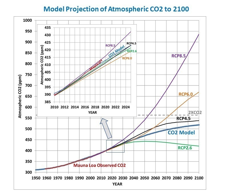 The Mauna Loa CO2 data clearly supports that hypothesis (Fig. 1 and Fig. 2). And the result is that, given the latest projections of CO2 emissions, future CO2 concentrations will not only be well below the RCP8.5 scenario, but might not even be as high as RCP4.5, with atmospheric CO2 concentrations possibly not even reach a doubling (560 ppm) of estimated pre-Industrial levels (280 ppm) before leveling off. This result is even without future reductions in CO2 emissions, which is a possibility as new energy technologies become available.