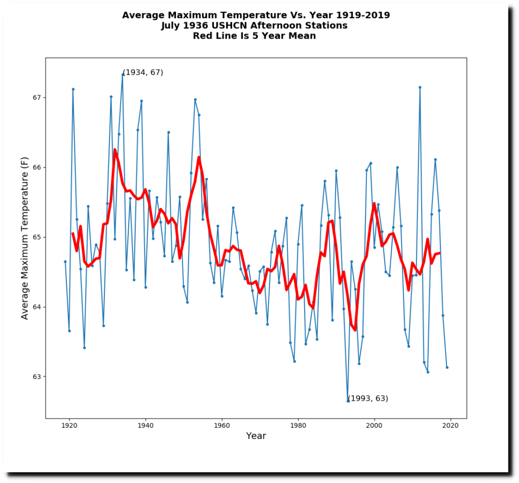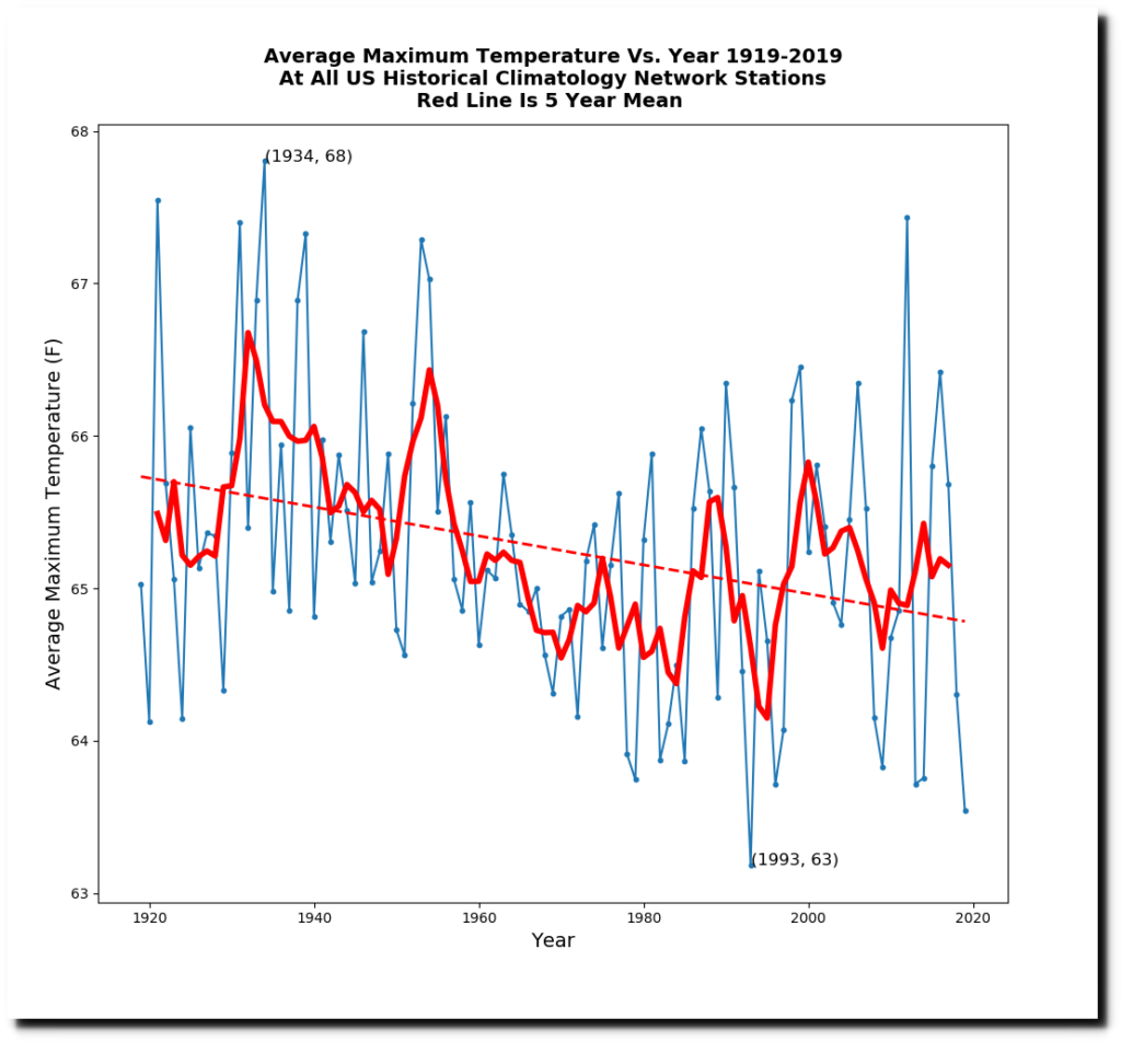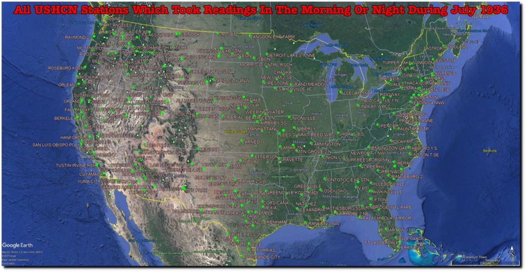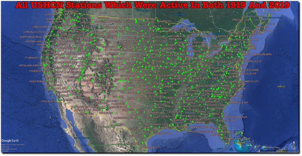 Zeke’s first excuse for data tampering was “changing station composition” – meaning that the USHCN station set has changed over time. It is simple enough to eliminate that problem by using only a stable set of stations. The map below shows all USHCN stations which were active in both 1919 and 2019.