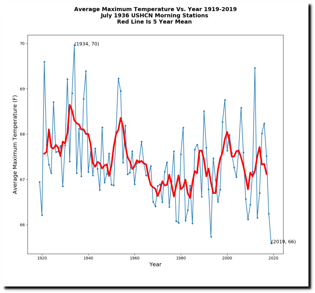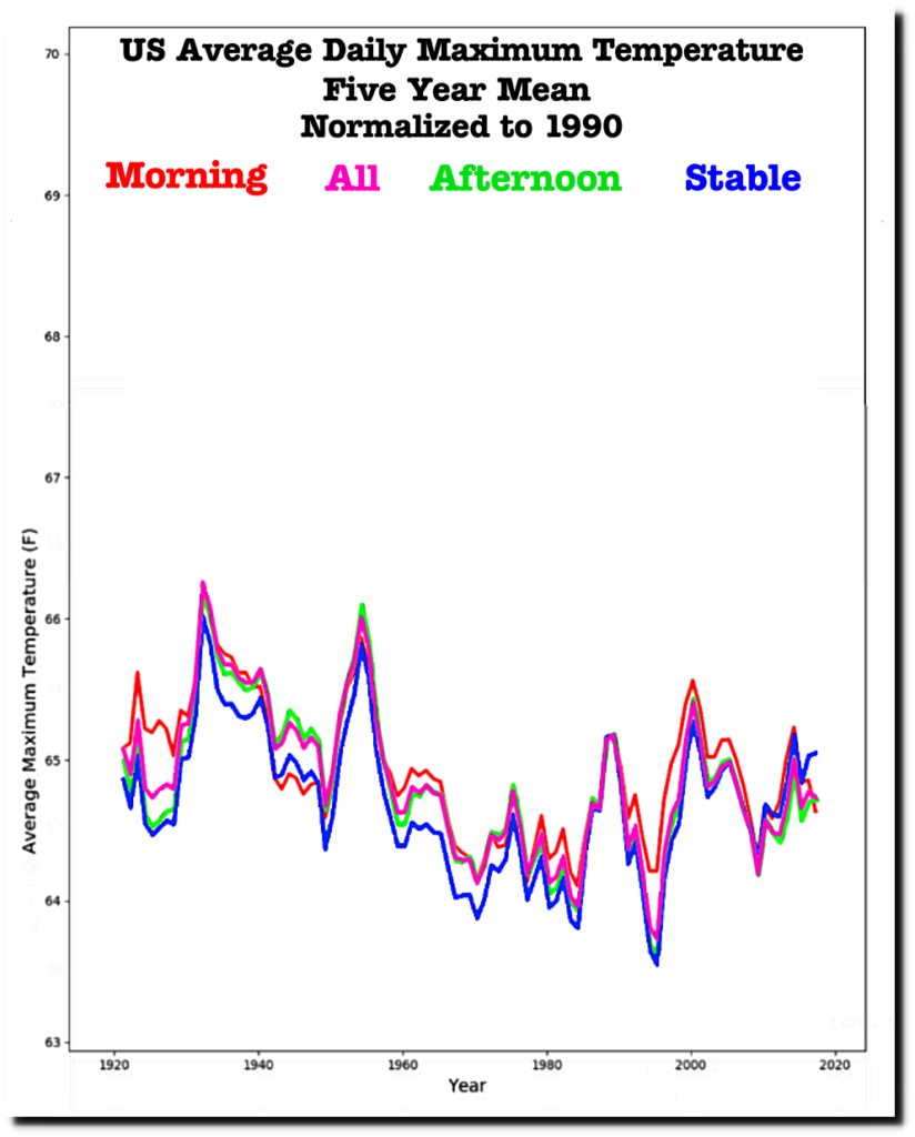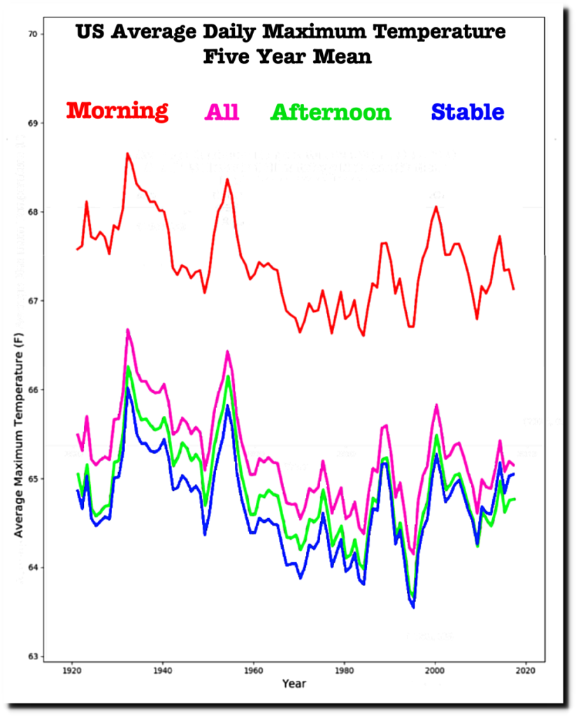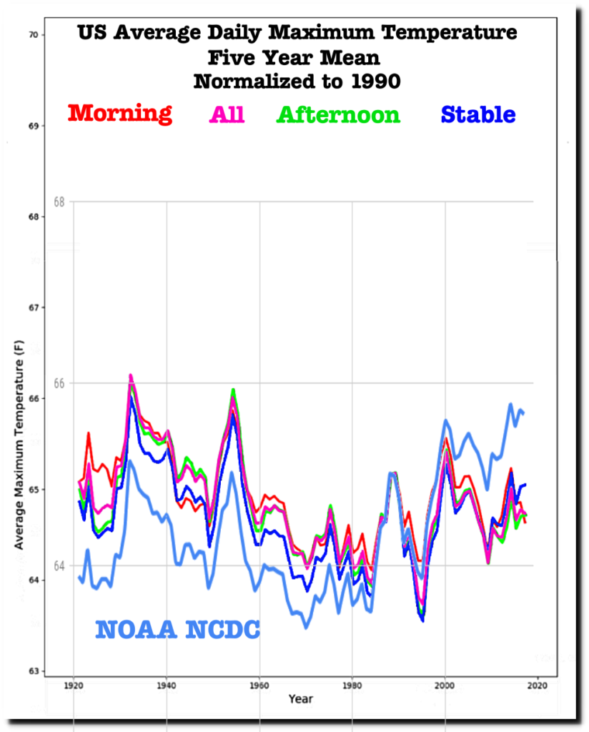 In the graph below, I combined four data sets. The set of all USHCN stations, the set of stable stations, 1936 morning stations and 1936 afternoon stations. The morning stations are warmer because the average latitude of morning stations is lower (people in warmer locations are more likely to read their thermometers in the morning.)