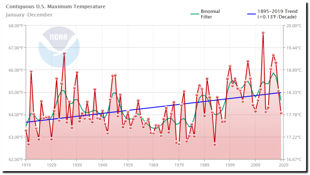 NOAA shows US afternoon temperatures increasing over the past century.