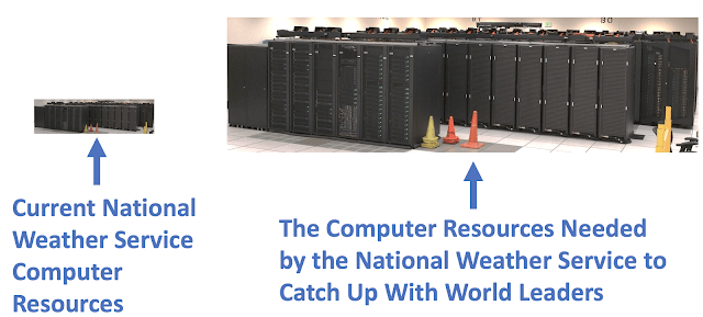 I spend a lot of time with NOAA and National Weather Service model developers and group leaders. They complain continuously how they lack computer resources for development and testing. They tell me that such resource deficiency prevents them from doing the job they know they could. These are good people, who want to do a state-of-the-art job, but they can’t do to inadequate computer resources.