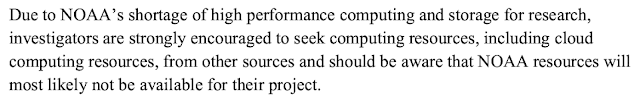 NOAA/NWS computer resources are so limited that university researchers with good ideas cannot test them on NOAA computers or in facsimiles of the operational computing environment. NOAA grant proposal documents make it clear: NOAA/NWS cannot supply the critical computer resources university investigators need to test their innovations (below is quote from a recent NOAA grant document):