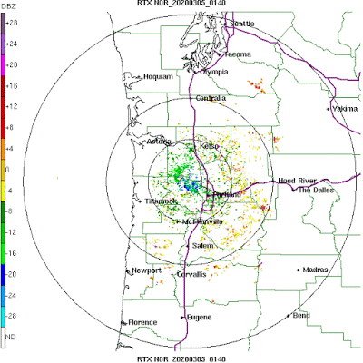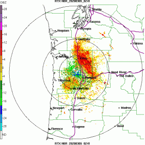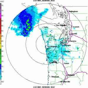 The Hoquiam (Langley Hill) radar showed the birds as well– here are the radar returns (called reflectivity) at 9:32 PM Wednesday night. The light blue are birds. They are not going very far offshore.