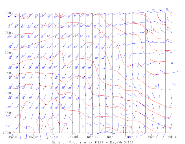 To show you this bird conveyor belt, here are the winds above SeaTac Airport for the 24 hours ending 10 AM Thursday. Time increases to the left and the Y-axis is height in pressure (700-hPa– is around 10,000 ft). Right after 7 PM Wednesday (05/03), the winds turned strongly southerly (from the south) and stated that way. Literally, a strong tailwind!