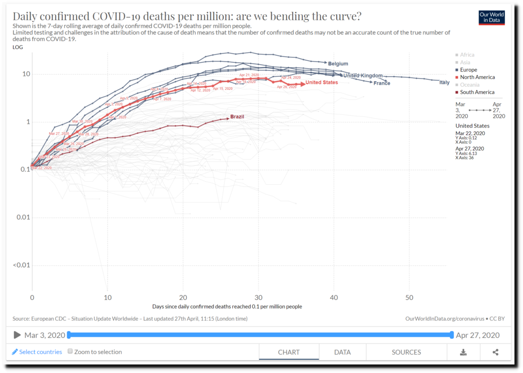 Daily confirmed COVID-19 deaths per million: are we bending the curve?