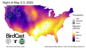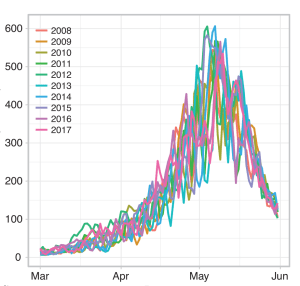 Finally, I should mention that there is all kinds of fascinating information in that Van Doren an Horton papers, such as the annual variation in bird migration over the U.S. based on the weather radar data (see below). Peak migration is in early-May, with a huge ramp-up in April…so we are very near the peak now. Thus, watching the radar now is of particular interest for all bird lovers.