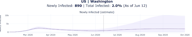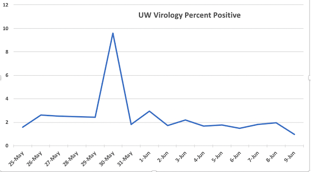 The percent positive tests at the University of Washington Virology Lab is shown below. If the virus was surging the percentage would go up quickly. Instead, it went down over the period with no rapid increase during the past week (some problem occurred on May 30th).
