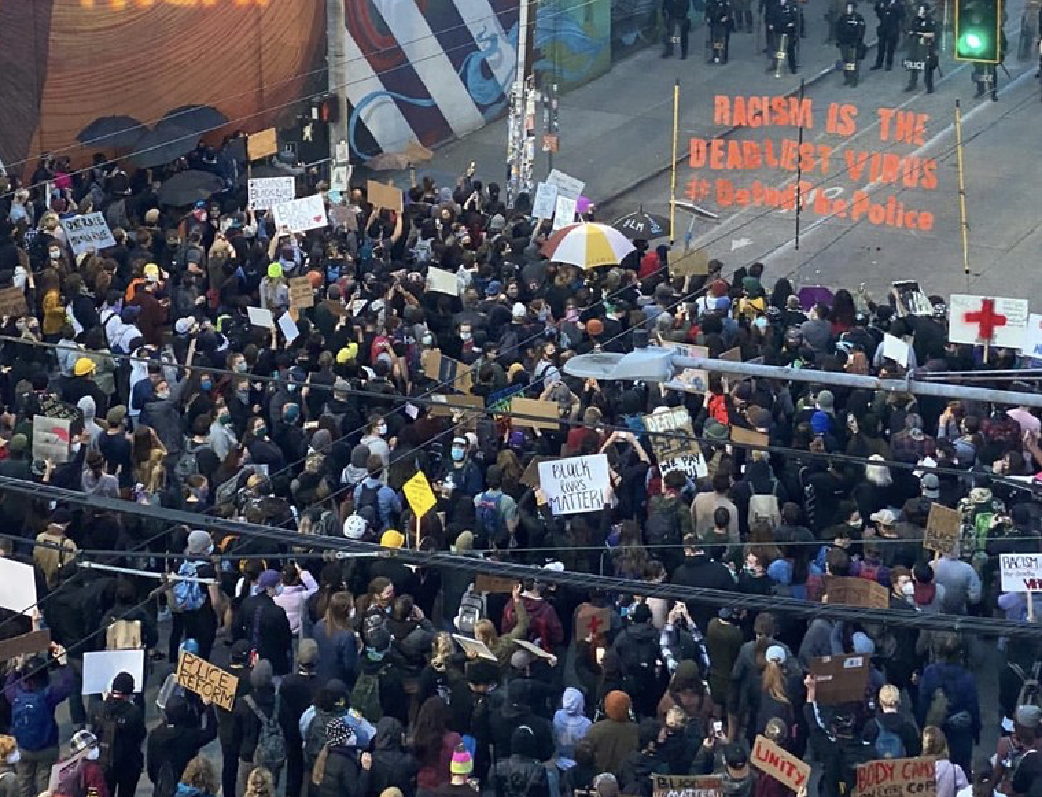 People are screaming, chanting and singing: activities that are optimal for spraying virus-laden droplets into the air. Many, but not all, of the protesters are wearing masks, with most of them using the less effective cloth ones. And tear gas causes people to cough and expel large quantities of mucus and droplets. If you want to spread a dangerous virus, you would think the protests are the perfect way to do it!