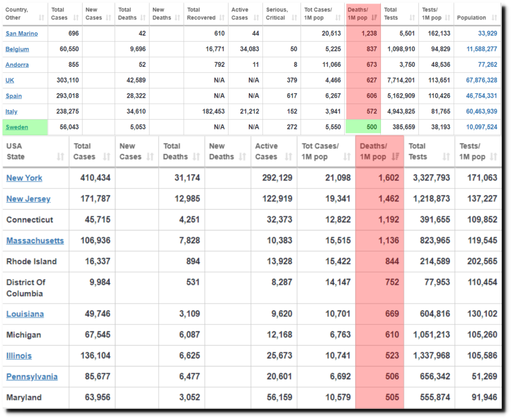 The same people who over predicted deaths in Sweden by 2000% now claim they have “the highest death rate in the world.” But death rates in Sweden are lower than San Marino, Belgium, Andorra, UK, Spain, Italy, New York, New Jersey, Connecticut, Massachusetts, Rhode Island, Washington DC, Louisiana, Michigan, Illinois, Pennsylvania and Maryland.