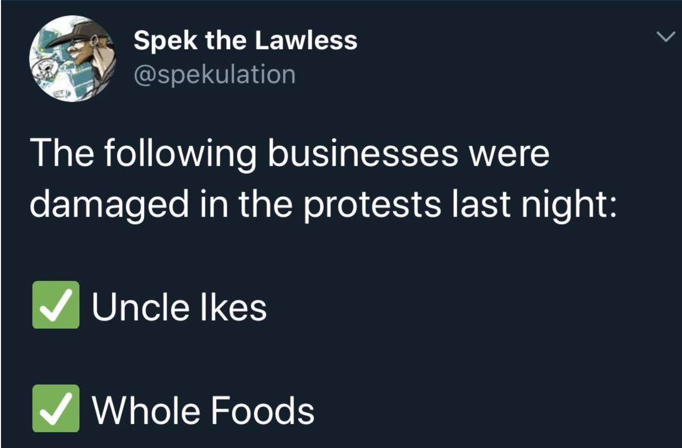 In Seattle, there were also massive amounts of broken windows, violent individuals were pillaging and damaging targeted groups they felt were unrighteous (e.g., Amazon, Chase, Starbuck). Some Jewish business were clearly targeted (e.g., Uncle Ikes, Samuel Jewelers)