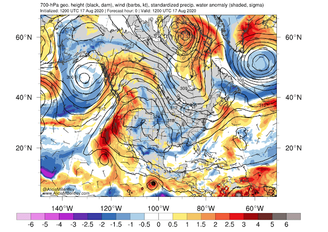 The event that occurred last week was the sixth highest for that period, which is impressive by itself. But there is more. It was the greatest 3-day lightning total in the entire period during the midsummer (June-August) period. So this was quite an extreme event to occur in the warm/dry California summer. One that followed an extreme warm period with a record-breaking upper-level ridge of high pressure centered over southern Nevada.An important aspect of the unusual event was the ability to tap the moisture of tropical storm and move it into central California (producing the thunderstorms). This is illustrated by the map below, which shows moisture around 10,000 ft (700 hPa pressure level) for 5 AM on August 17th. The moisture levels getting into California were as much as 4-5 standard deviations from the normal. Trust me…this is very, very unusual. Like never happening before on that date.