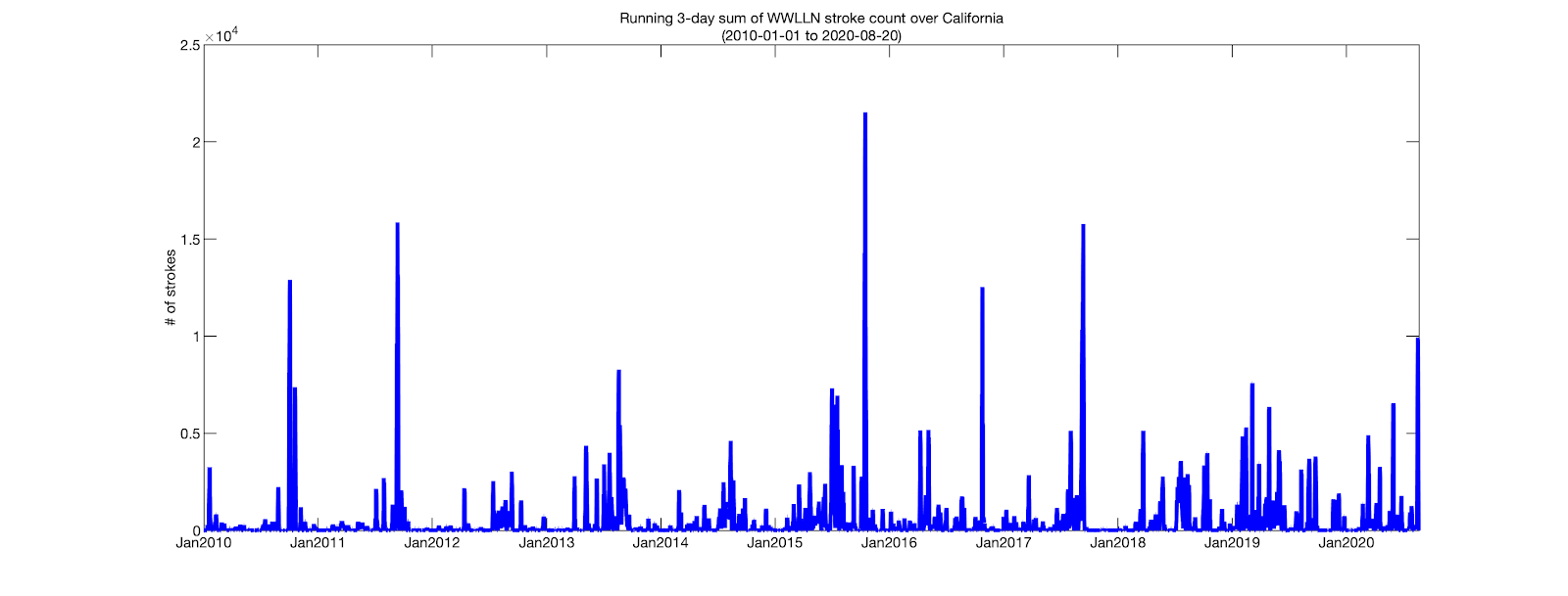Smoke situation this morningThe situation this morning was extraordinary. According to CALFire, more than 14,000 firefighters are dealing with 650 fires (two dozen major ones) that have burned over 1.25 million acres. There have been 7 fire-related deaths and 1400 structures lost.The “lightning siege” over the past ten days has resulted in over 13,000 lightning strikes, many of which were from high-based thunderstorms that did not provide much rain to the surface (rain evaporated on the way down!).How unusual was this large number of lightning strikes in mid-August?The answer: very unusual.When I want to get information about lightning statistics, I know where to go: Professor Robert Holzworth of UW ESS and Dr. Katrina Virts, a past associate of Dr. Holzworth who is now a NASA scientist. Dr. Holzworth runs a major lightning network (WWLLN) and a lightning expert, and Dr. Virts is the Mozart of lightning statistics.Anyway, within of hours of inquiring about the situation, Dr. Virts sent me a graph showing 3-day lightning totals going back to late 2009 (below, click to enlarge).