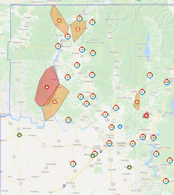 Tens of thousands are without power in eastern Washington, with trees falling on power lines. Falling powerlines probably started some of the fires (Spokane outages shown below).