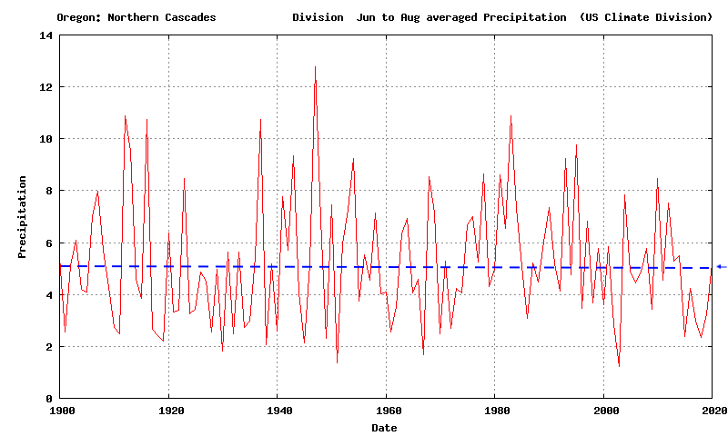 To answer these question, let’s examine the precipitation over crest and western slopes of the northern Oregon Cascades—the region where many of the big fires originated and grew. Below is a plot of the June to August precipitation over the region from the NOAA/NWS climate divisions data (Division 4 of Oregon) for 1900 to 2020. The summer 2020 values is not exceptional at all (indicated by small arrow and the horizontal dashed line). And there is little overall trend in the precipitation for that region.