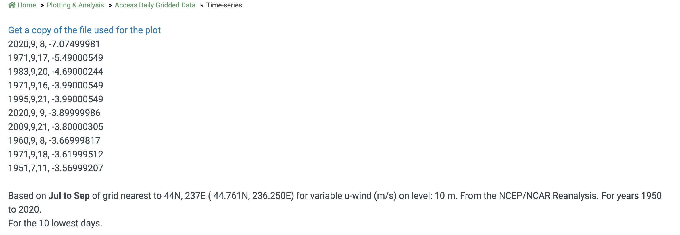 To examine this, I searched gridded weather data (the NCAR-NCEP reanalysis) for a grid point on the western slopes of the Oregon Cascades. Specifically, I examined the strength of the daily average zonal (east-west wind), looking for the days of strongest easterly wind. For example, I checked surface wind (10-m above the surface) from 1950 to today for July through September–the relevant months– and found the top ten cases.