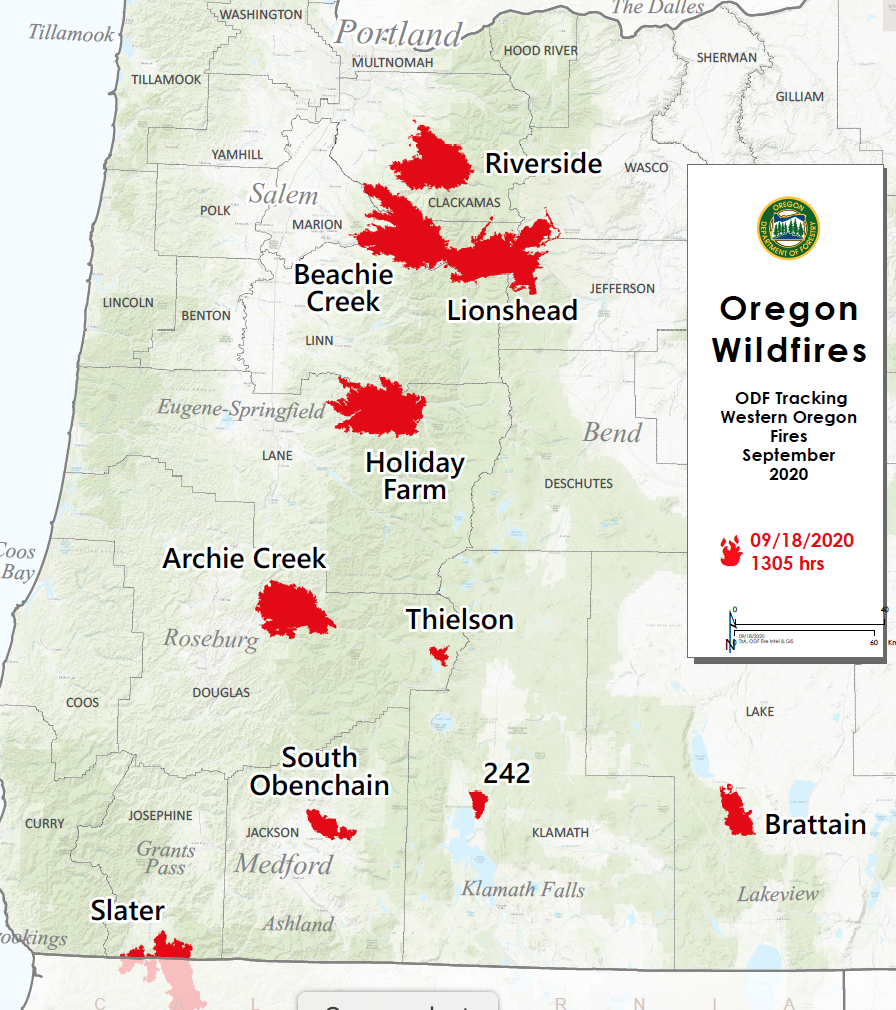 A series of major fires exploded on September 7-8, 2020, ranging from the Big Hollow Fire northeast of Portland, the Riverside, Beach Creek and Lionshead Fires east of Salem, the Holiday Fire near Eugene, and the Archie Creek, South Obenchain and other fires to the south. Several of the western Cascade Range fires, which have spread over more than 350,000 acres, had been initiated by lightning in mid-August, smoldering until strong easterly winds caused rapid expansion.