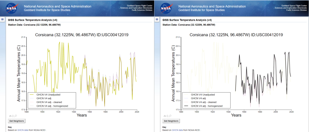 Looking at the GHCN V3 Unadjusted data, Corsicana has had a cooling trend, but the station didn’t have annual temperature data from 1880 to 1892.
