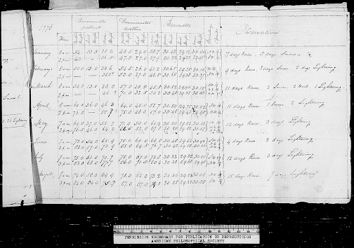 Check out his observation summary of 1776 below. A few days after signing the Declaration, he went out and bought a barometer. The kind of thing I would do!
