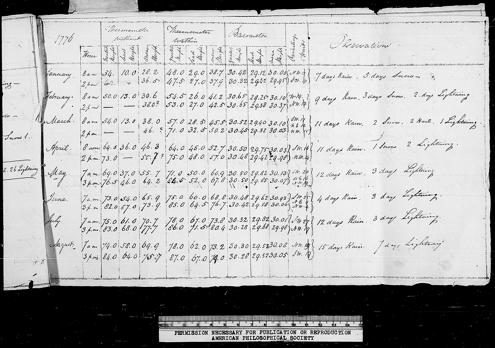 By the time of the American revolution, relatively decent thermometers, barometers, and rain gauges were available, and taking weather observations was all the rage.