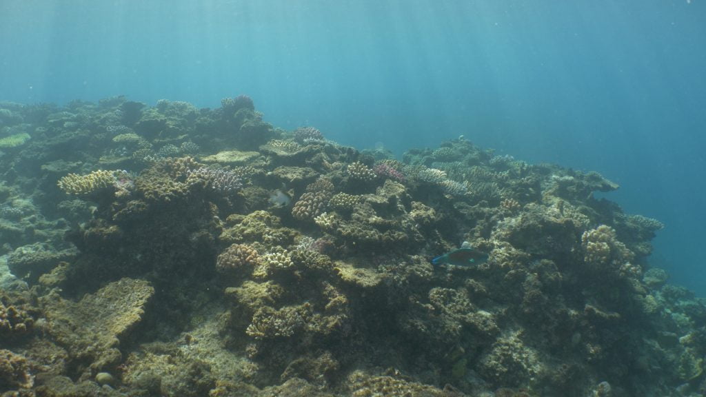 The feature image shows a dead, and algal infested plate coral in the foreground. The second image shows dead plate corals as the ridge drops away. In the third image there are two very large dead plate coral to the left, and another towards the bottom of the drop-off. In the fourth picture I’m holding on to a more recently dead plate, now covered in algae. The fifth and sixth photographs are of more dead plate corals, and also parrot fishes.