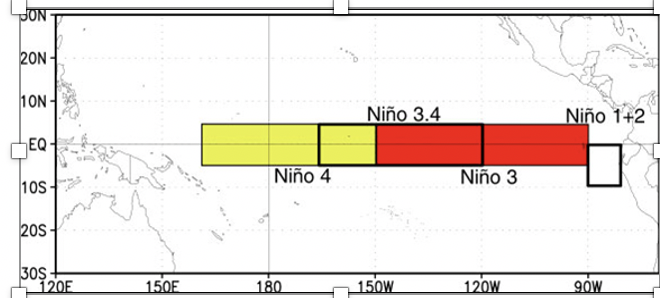 To show this, let’s start by looking at the sea surface temperature anomaly (difference from normal) for the central tropical Pacific, an area called the Nino 3.4 region (see map).