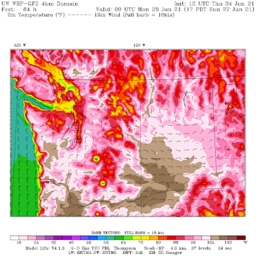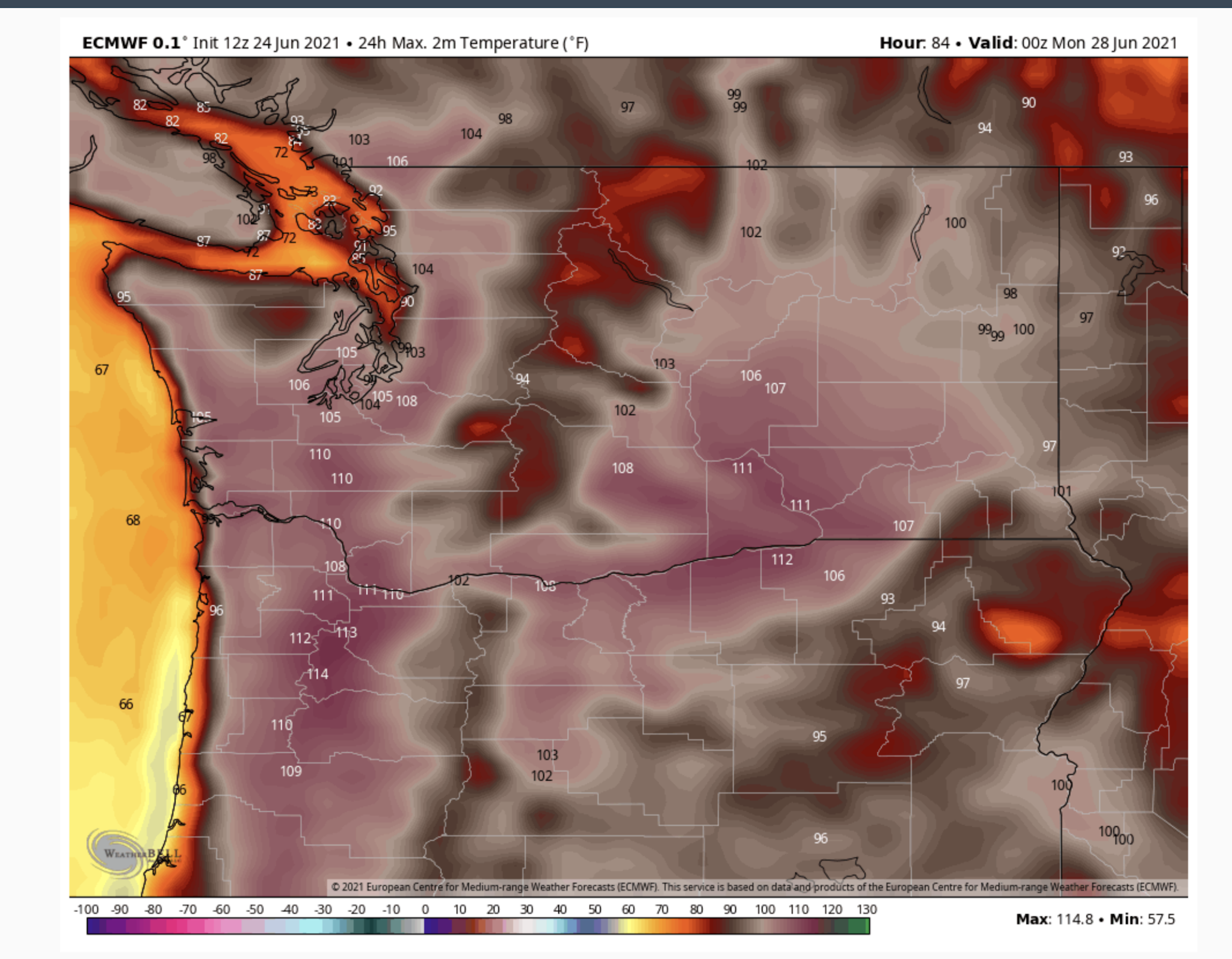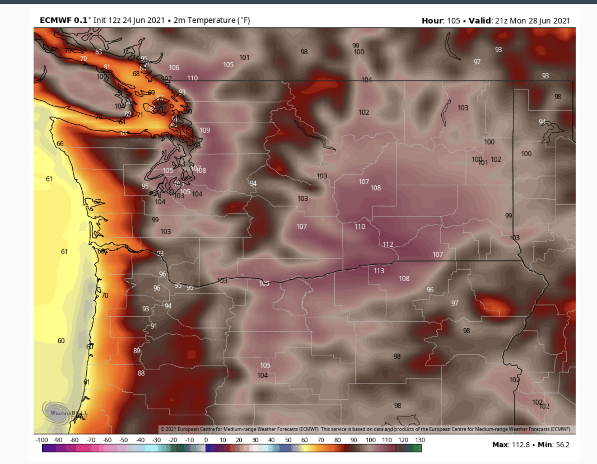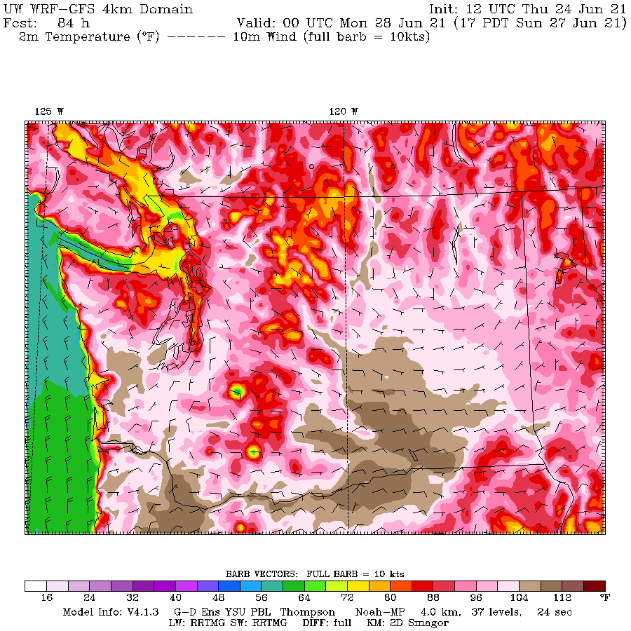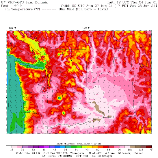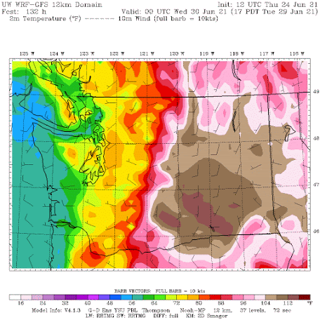 Later Monday, marine air will start to move in along the coast, resulting in Tuesday being a bit cooler west of the Cascade crest (see temperatures at 5 PM Tuesday below). But it will be showtime for the Columbia Basin where the model is going for temperatures OVER 112 F. It is not inconceivable that some locations in eastern Washington will tie or exceed the all-time temperatures record for the state (118F).