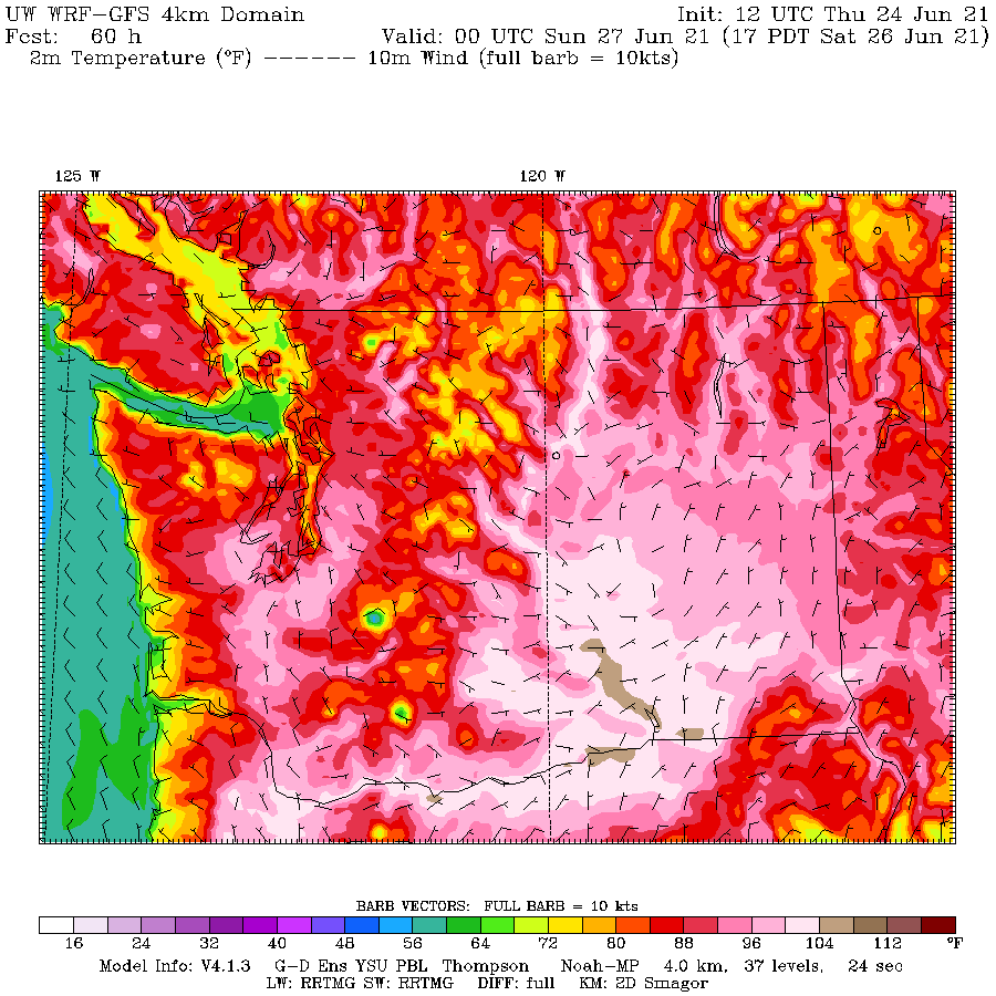 Sunday is something else. Temperatures in the Willamette Valley surge ABOVE 108F, as do the lower elevations of the Columbia Valley. Incredibly, some areas south of the Olympic Mountains get above 104. Can you imagine the temperature gradients near the coast… from the 60s to over 100F in a matter of a few miles? In central Puget Sound, temperatures will rise the 80s near the water to the upper 90s a few miles inland.