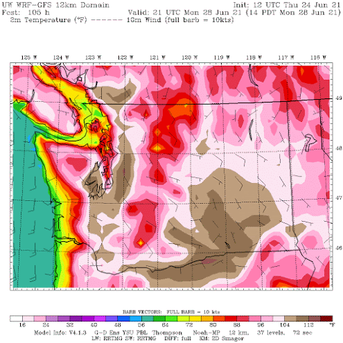 And now Monday at 2 PM. The model resolution is a bit less but the solution is absolutely amazing. Temperatures exceeding 108F will be found in and near the western Cascade foothills, thanks to the warming easterly flow descending the barrier. 104F and higher away from the water around Puget Sound. The Fraser River Valley will also be crazy warm.