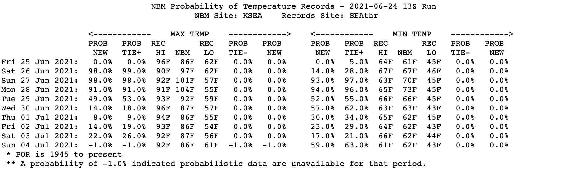 Let me say again: the ensembles of many forecasts show that this solution is the preferred one, with a high probability of verifying. The National Weather Service’s most advanced statistical postprocessing system (the National Blend of Models) that combines many forecasts in an optimal way is now going for 101F on Sunday and 104F on Monday at SeaTac Airport: