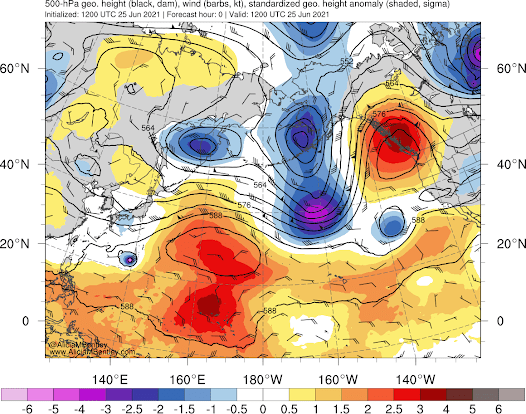 Upper level (500 hPa pressure, about 18,000 ft) for 5 AM this morning. Red indicates higher than normal pressures/heights, blue below normal. Note the highly amplified wave pattern