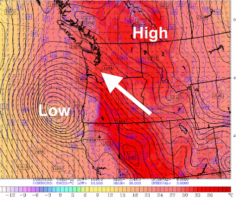 At the surface, this feature is associated with high pressure to the east of the Cascade crest, which tends to produce weak offshore (easterly) flow. Such easterly flow keeps the cooling influence of the Pacific Ocean away.