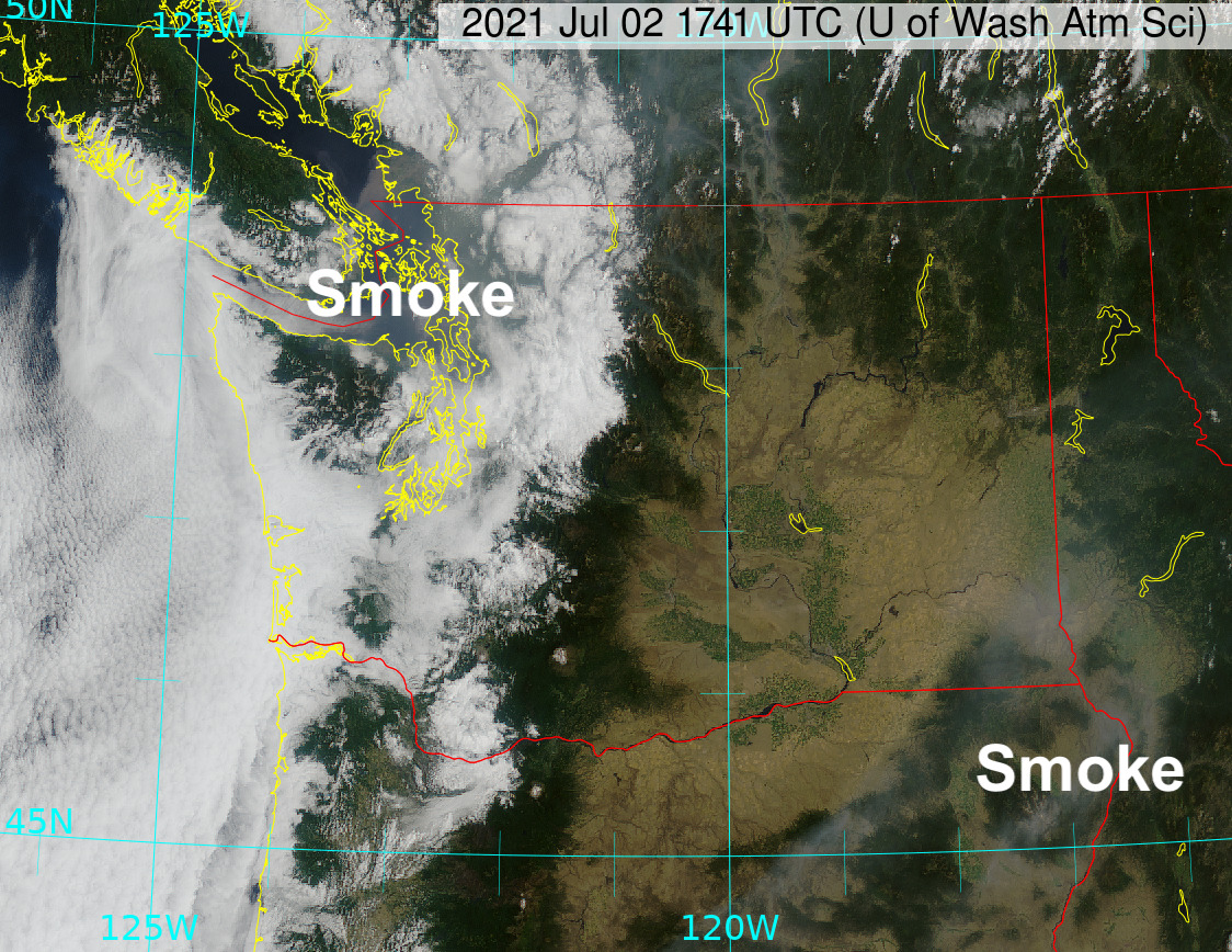 And the podcast also includes the latest forecast, predicting dry conditions and temperatures in the lower 80s west of the Cascade crest, and around 100F for eastern Washington. Wildfires have started north and souther of Washingon and some smoke is moving in aloft (see satellite image this morning).